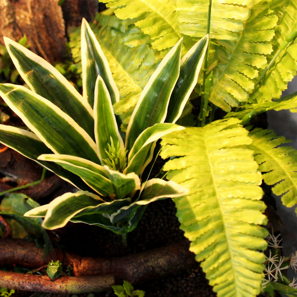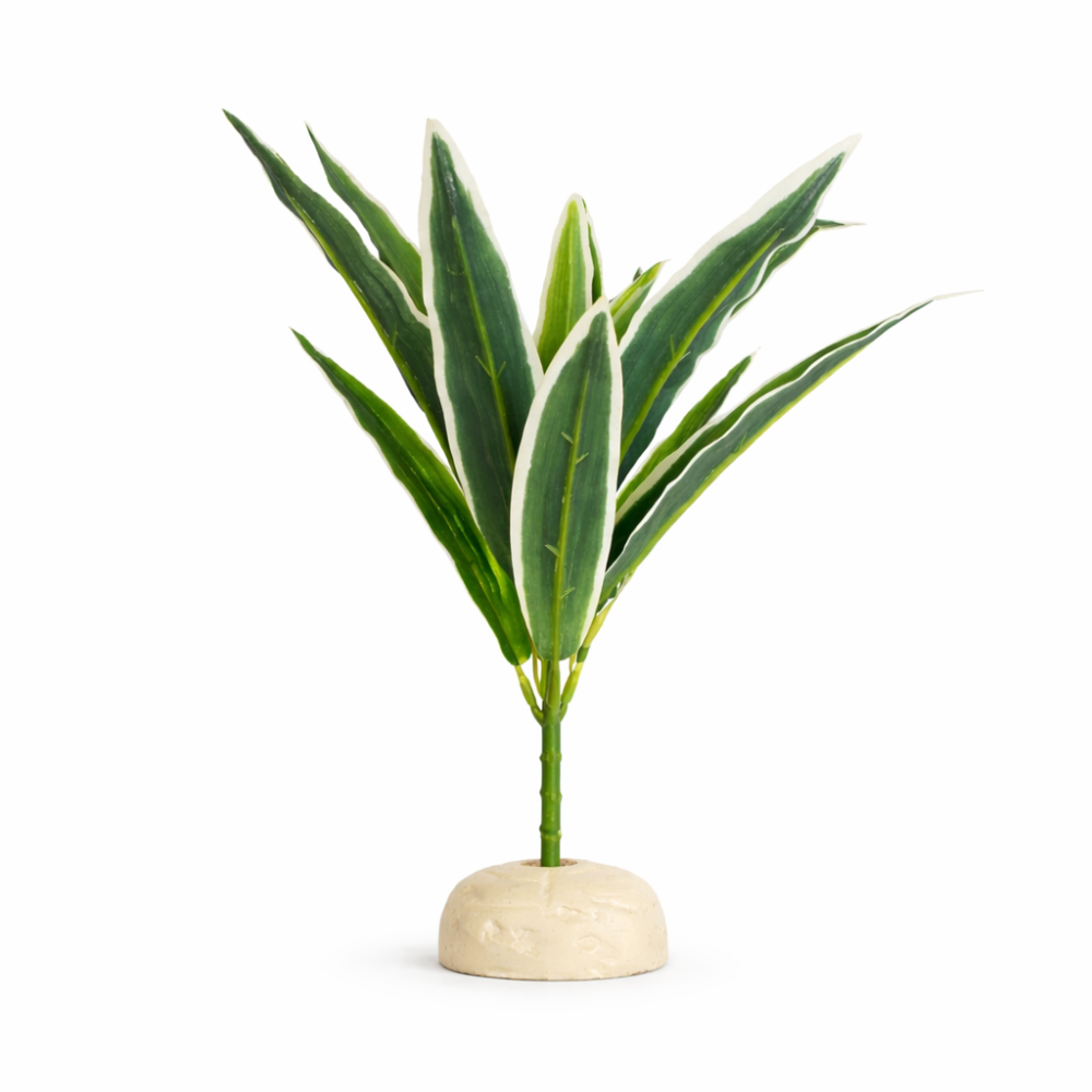 Természetes hatású, hosszú levelű műnövény, amely tökéletes választás terráriumok berendezéséhez. A zöld, világos szegélyű levelek egzotikus, trópusi megjelenést kölcsönöznek, így ideális környezetet teremtenek gekkók, kígyók, pókok és más terráriumi állatok számára.