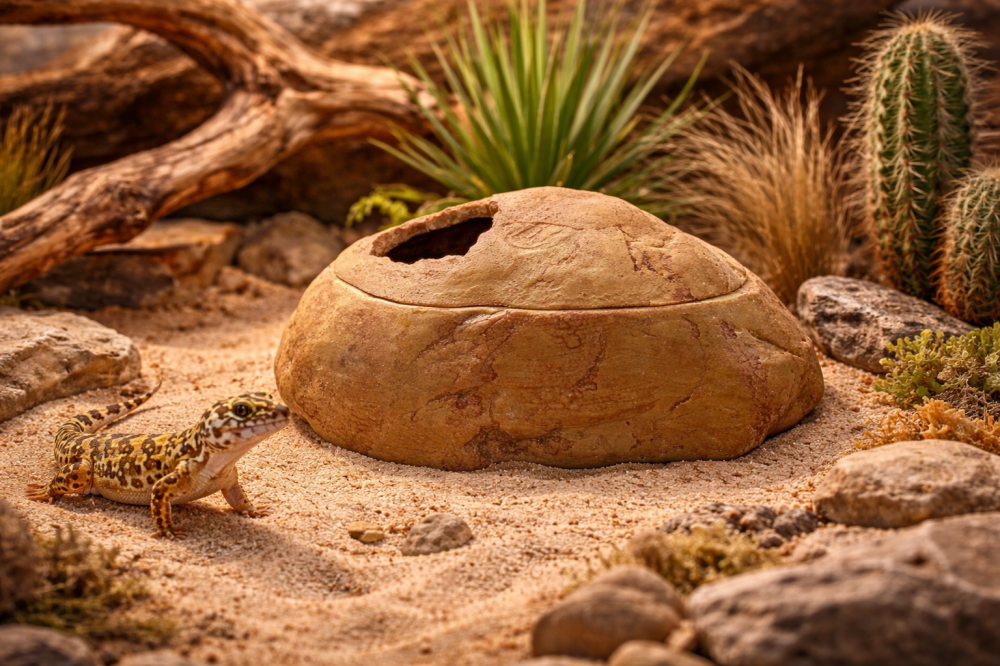 A masszív, stabil kialakítás és a természetes kőhatású megjelenés tökéletesen illeszkedik sivatagi és trópusi terráriumokba is.