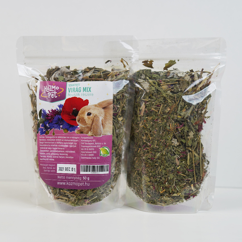 A Virág Mix egy gondosan összeállított, szárított növényekből és virágrészekből álló természetes táplálékkiegészítő, amely kisállatok – különösen nyulak, tengerimalacok, hörik, csincsillák és egyéb növényevő rágcsálók – számára készült. A keverék nemcsak ízletes csemege, hanem értékes rost- és vitaminforrás is, ami támogatja az emésztést, az immunrendszert és hozzájárul a jó közérzethez.